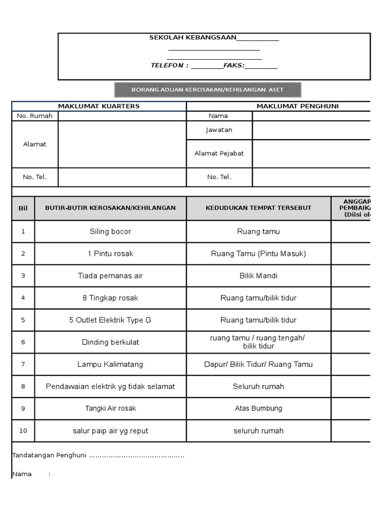 Borang aduan kerosakan peralatan komputer. Ruangan ini perlu dilengkapkan oleh pengguna segera. Gunakan borang ini untuk menghantar aduan kerosakan. Borang aduan kerosakan fasiliti & pejabat. Posted by unknown at 5:41 pm. Aduan borang aduan kerosakan perkakasan/perisian ict. Tarikh aduan bahagian / unit. Borang aduan masalah/ kerosakan ict. Sila isi maklumat yang disediakan dibawah. Sjk (c) pekan lama jalan bakar sampah 08000 sungai petani kedah darul aman sjkcpl/it/b01 borang aduan kerosakan komputer no. Bahagian i (untuk diisi oleh pengadu). Borang aduan kerosakan aset alih kerajaan bahagian i (untuk diisi oleh pegawai aset). Sekiranya anda menghadapi masalah seperti berikut sila isikan borang2 seperti berikut (pilih mana yang berkenaan) :