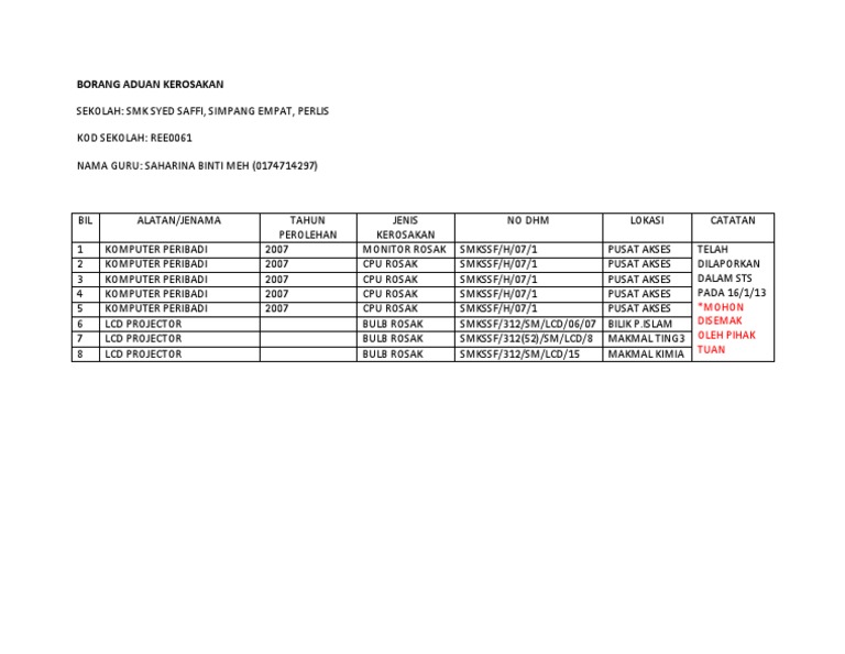Image result for contoh surat aduan kerosakan komputer doc ... from i.pinimg.com Menyemak senarai rekod kerosakan bagi mengetahui jenis kerosakan. Free & easy!app builder no coding! Posted by unknown at 5:41 pm. Borang permohonan baikpulih kerosakan kecil kuartes pejabat daerah jempol maklumat pegawai yang menduduki nama pegawai no. Borang aduan kerosakan from alif naqiuddin. Sjk (c) pekan lama jalan bakar sampah 08000 sungai petani kedah darul aman sjkcpl/it/b01 borang aduan kerosakan komputer no. Pilih jenis aset almari cctv karbinet katil kerusi komputer lampu lct cctv lif meja penghawa dingin peralatan bilik mandi peti pilih lokasi kerosakan pentadbiran penginapan surau dewan pos pengawal persekitaran ilsm. Aduan borang aduan kerosakan perkakasan/perisian ict.
